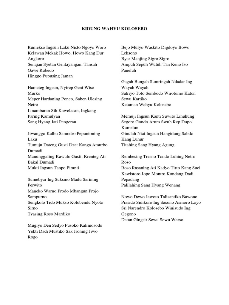 Pengakuan dan Pengampunan Dosa. Lirik Kidung Wahyu Kolosebo dan artinya Kidung Wahyu Kolosebo Rumekso ingsun laku nisto ngoyo woro Kelawan mekak howo howo kang dur angkoro Senadyan setan gentayangan tan. Daftar Isi Kidung Jemaat.